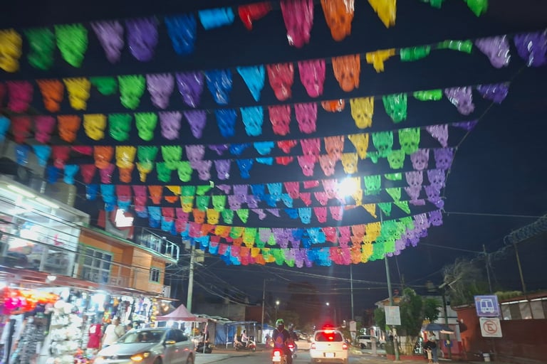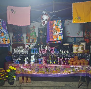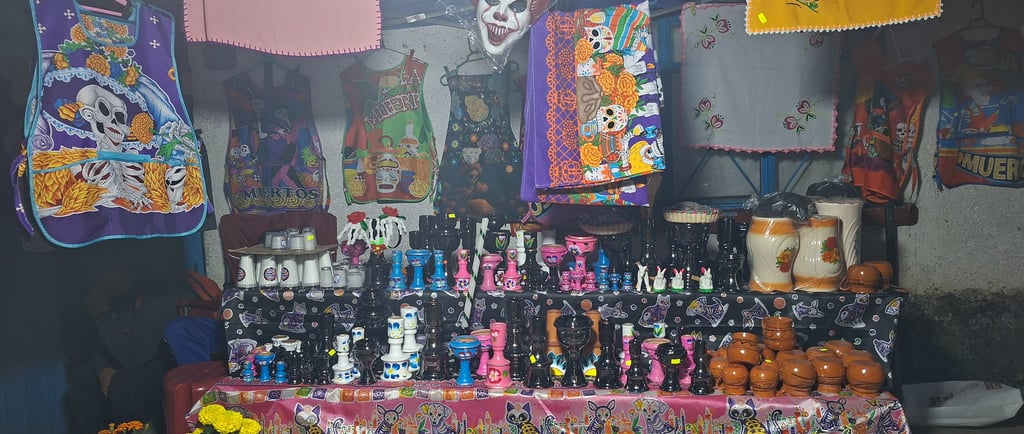 Resulta que ya el pueblo se esta preparando para recibir a sus muertos, el 18 de octubre hasta sonaron bandas de viento, y hubo baile de chinelo, danza tradicional de Morelos, comenzando todo casualmente a las 12:00 p.m, casualmente hora numinosa por excelencia y por supuesto de comer mole, que en verdad se antoja ya que el aroma está en todos lados junto con el de tortilla y copal. y es que ese día se reciben a “los matados” , aquellos que murieron en actos de violencia y el 19 se adornan sus tumbas en el panteón. Hoy 23 lo cohetes suenan por todas partes, ya es de noche y se han intensificado, comienzan a abundar catrinas, cempaxúchitl, veladoras, adornos, copaleros, servilletas bordadas, canastos y todo lo necesario para que la gente alague a sus muertos. Y ¿los cohetes? Pues es que resulta que anuncian los novenarios, así que si tienes buen oído con solo seguir el sonido que esta por todas partes y comienzan desde temprano te guiarán a casa del muerto en donde te servirán tu atole, café o pan y tu los acompañaras en el novenario o rosario.