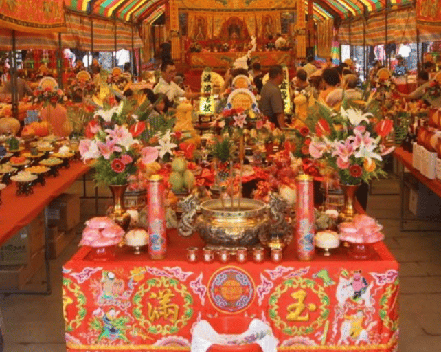 El ritual central del festival se articula en torno a las ofrendas y prácticas apotropaicas. Las familias disponen altares con alimentos, frutas, té y arroz para sus antepasados, acompañados del encendido de varitas de incienso que actúan como guía espiritual. Asimismo, se queman ofrendas de papel joss o 'dinero del infierno', concebidas como bienes materiales destinados a garantizar el bienestar de los muertos en el más allá. Otro de los rituales más significativos es la suelta de linternas flotantes en ríos o lagos, cuyo propósito es iluminar el camino de los espíritus errantes de regreso al inframundo.